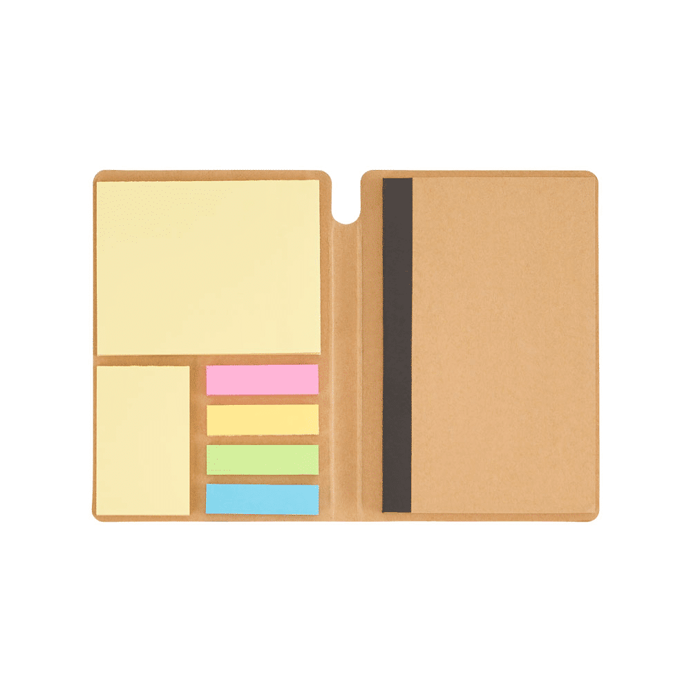 Bloco de anotações com elástico, sticky notes, miolo sem pauta na cor bege.