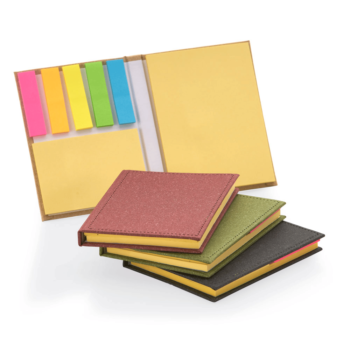 Bloco de anotações ecológico com caneta de papelão. Possui detalhe “smile” na capa frontal(verso liso), caneta ecológica com acabamentos em plástico acionada por clique, primeira folha(branca) com cinco blocos autoadesivos coloridos com aproximadamente 20 folhas cada, bloco amarelo com aproximadamente 20 folhas e 70 folhas brancas pautadas.