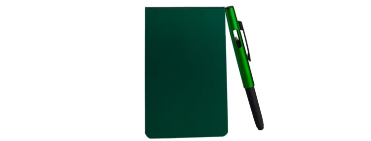 - Caneta Esferográfica em ABS Prata: A caneta esferográfica é feita em ABS prata, proporcionando um contraste elegante com a cor verde do bloco.