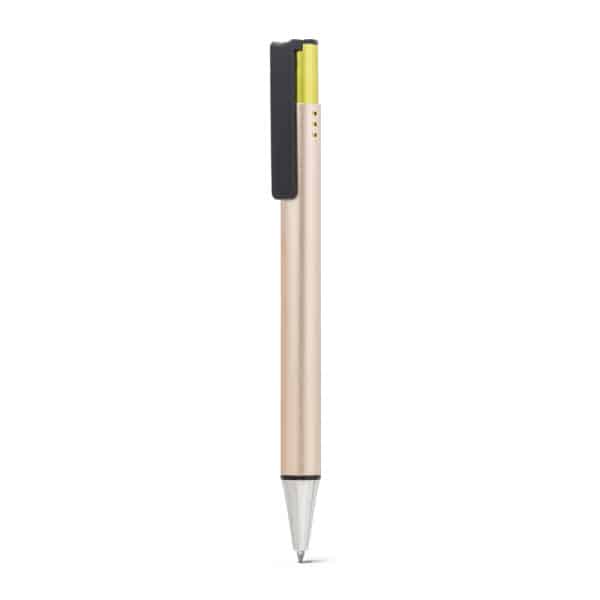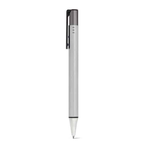 Esferográfica. Alumínio e ABS. Acabamento metalizado. 1,5km de escrita.