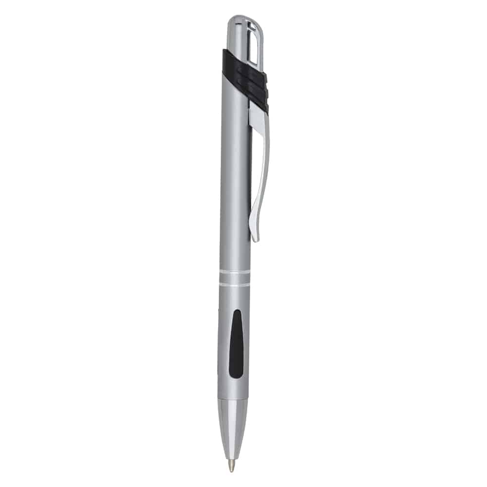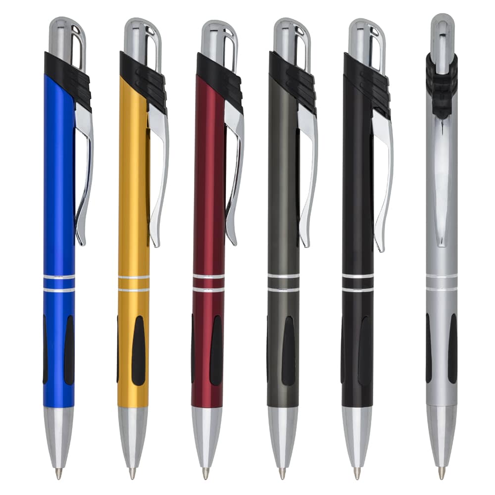 Caneta metal inteira colorida com detalhes prata. Clip metal com detalhe preto com relevo em plástico, possui dois anéis e detalhe emborrachado preto na parte inferior. Aciona por clique.
