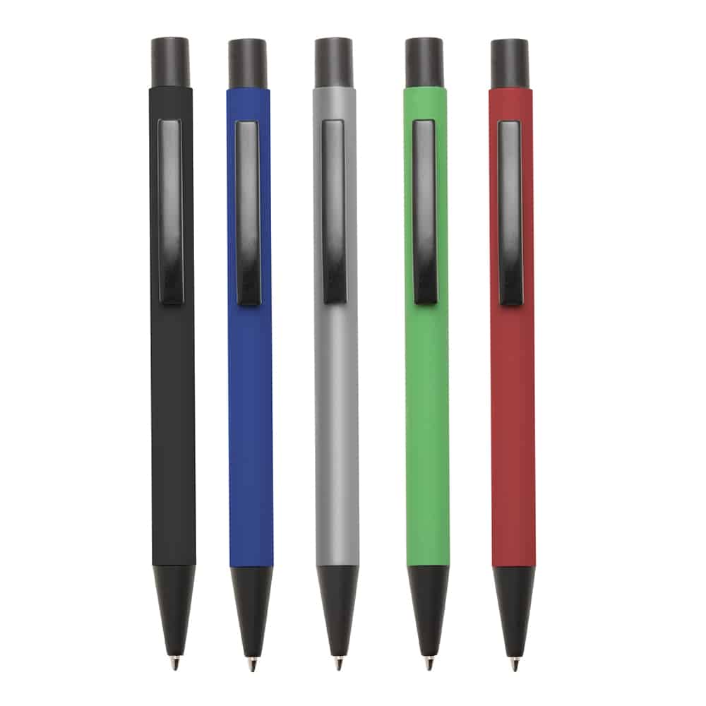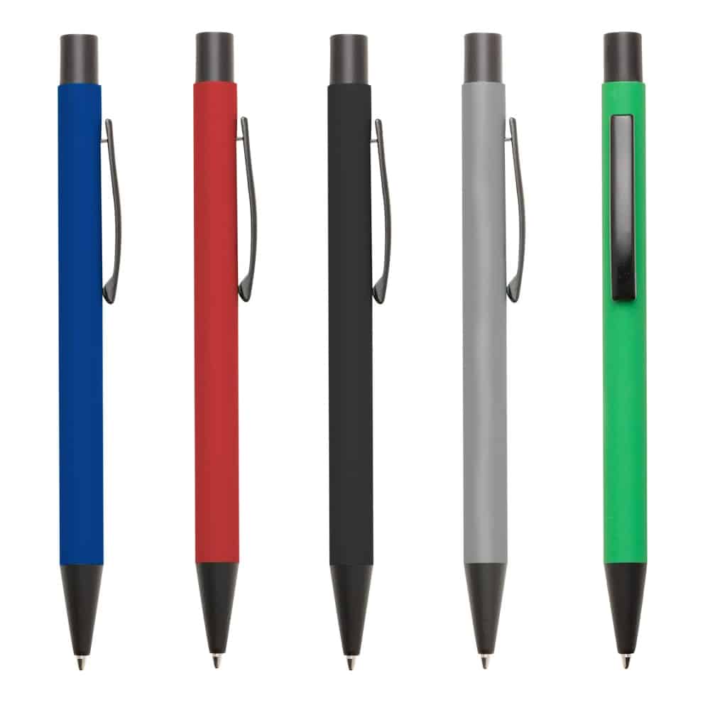 Caneta metal com pintura fosca colorida, acionador, clip e ponteira na cor preta. Aciona por clique.