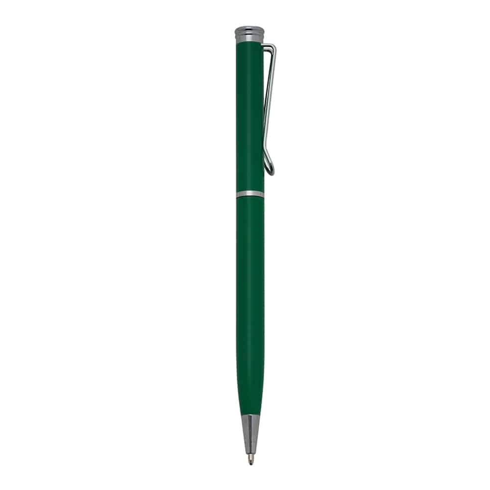 Caneta metálica com pintura fosca colorida e detalhes em prata. Clip metálico, acionamento por giro e carga esferográfica azul.