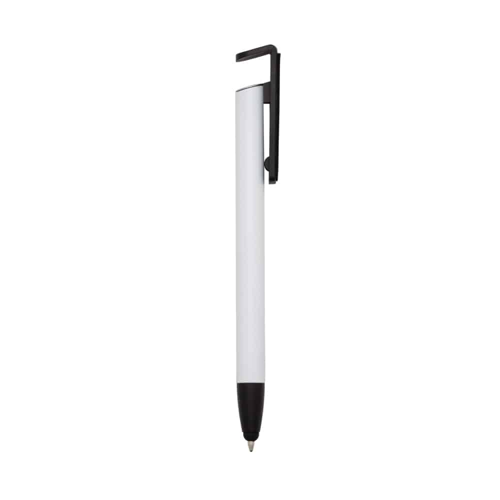 Caneta metal multifunções. Corpo colorido e detalhes preto, possui clip com limpador de teclado e parte superior vazada para ser utilizada como suporte para celular. Parte inferior com borracha touch, aciona por clique.