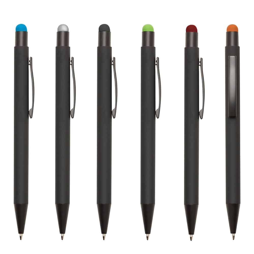 Caneta metal com ponteira touch colorida e pintura em preto fosco. Quando personalizada, a gravação possuirá a mesma cor da borracha touch. OBS.: A cor preta deverá ter a personalização amarelo/dourado. Aciona por clique.