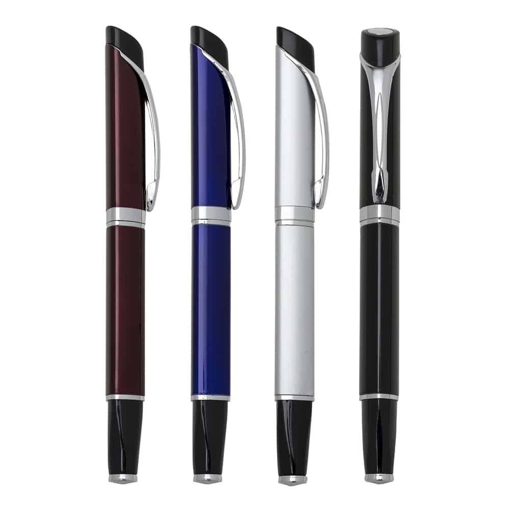 Caneta de metal triangular inteira colorida com tampa. Clip metal e possui um círculo prata na parte superior, possui anel prata no centro e na parte inferior. Pintura preta parte inferior com a ponta prateada.