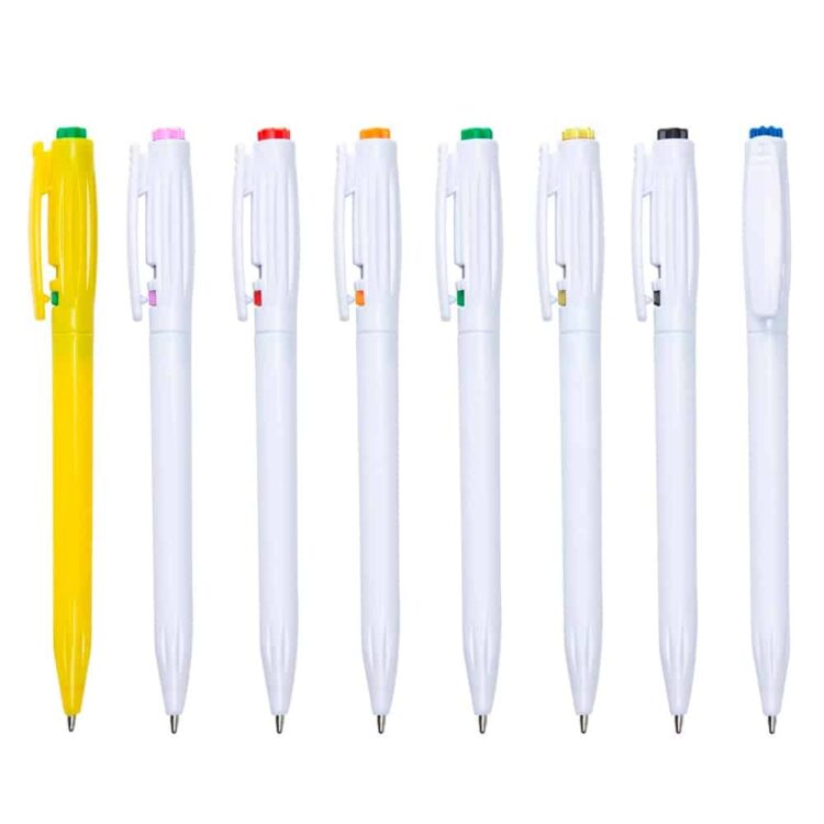 Caneta plástica branca com detalhe colorido. Possui detalhes em relevo na parte superior ao redor do clip, parte inferior com detalhes em relevo. Aciona por clique e para destravar basta apertar a parte inferior do clip.