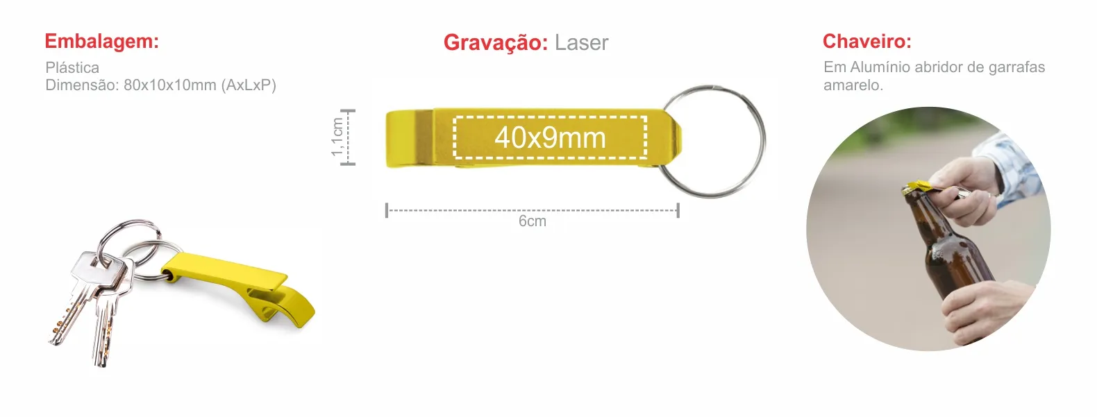 Adicione um toque de cor e conveniência à sua rotina com o Chaveiro em Alumínio Abridor de Garrafas Amarelo. Ideal para compras em grande quantidade, este produto é perfeito para atender às necessidades do seu ecommerce. Garanta já o seu conjunto e experimente a praticidade de um abridor sempre à mão.