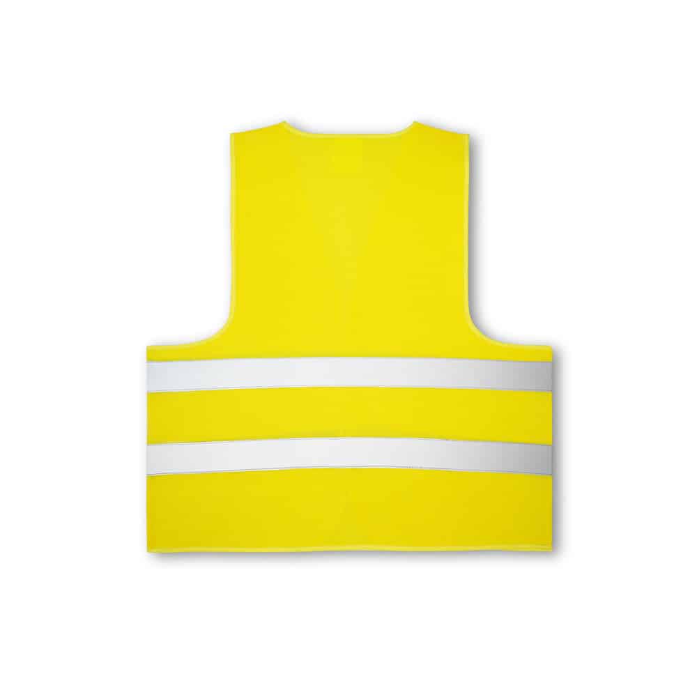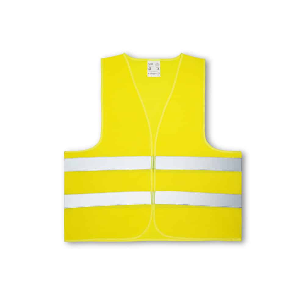 Colete de alta visibilidade em 100% poliéster com certificado pela norma EN ISO 20471 classe 2. Colete refletivo com 2 bandas refletoras horizontais e abertura frontal com fecho de velcro.