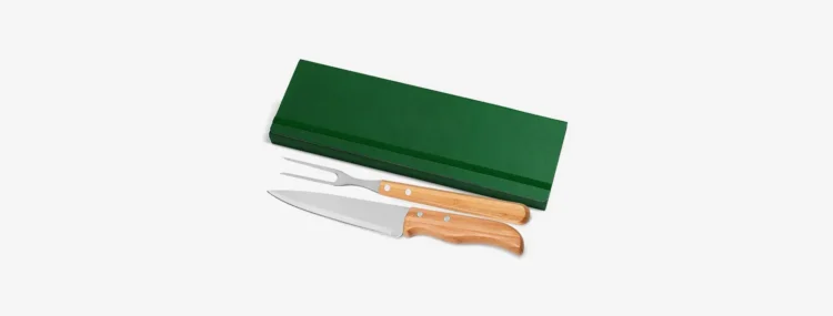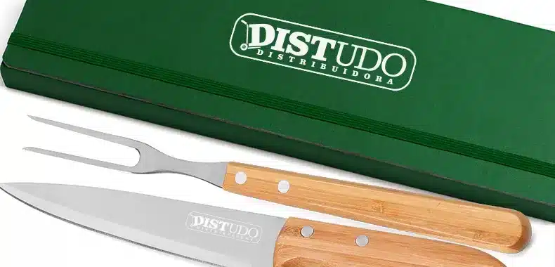 • Faca e garfo trinchante, ambos com cabos em bambu, proporcionando uma sensação natural e ergonômica durante o manuseio.