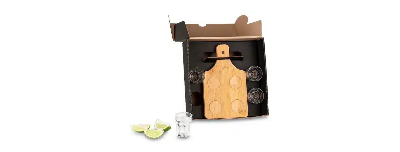 Desfrute de momentos descontraídos e elegantes com o Conjunto em Bambu com 4 Copos para Dose. Este conjunto, composto por uma tábua em bambu e 4 copinhos de vidro com design retrô, é perfeito para servir suas bebidas favoritas em grande estilo.