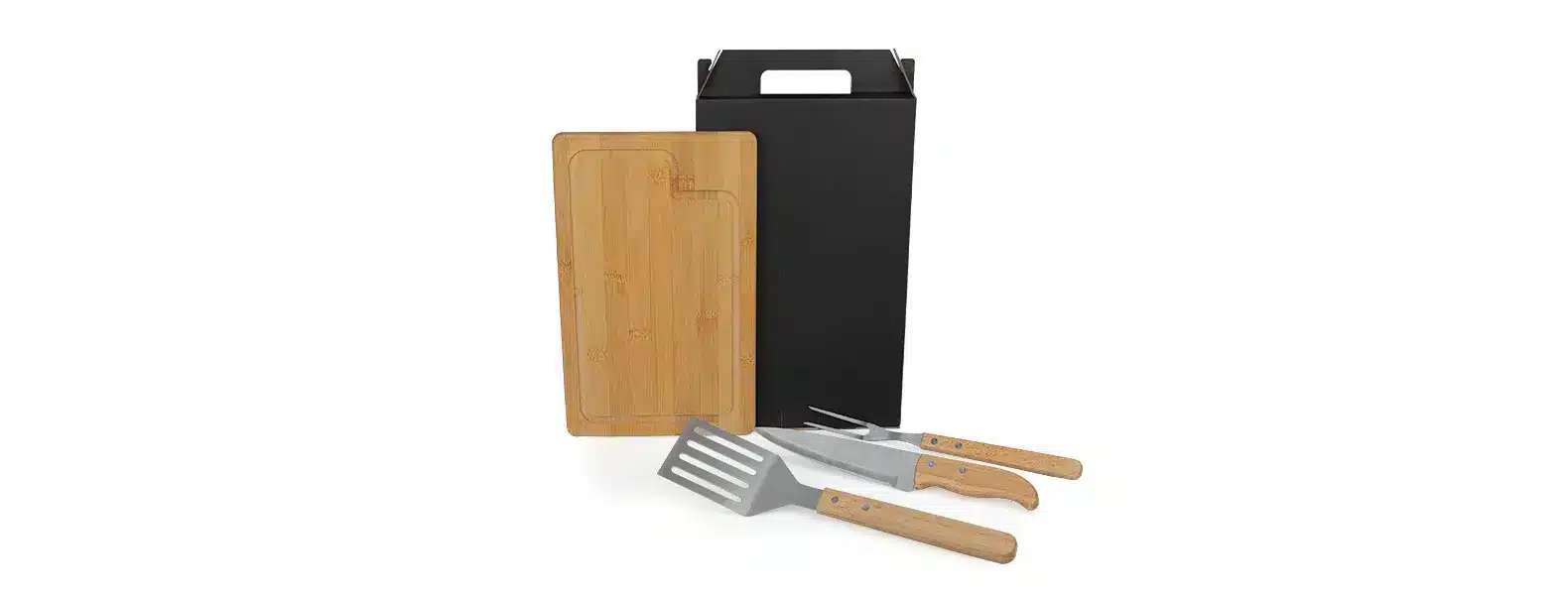 Aprimore suas sessões de churrasco e preparo de hambúrguer com o Conjunto para Churrasco/Hambúrguer, um kit elegante e funcional composto por uma tábua em bambu, uma faca de 7″, um garfo e uma espátula perfurada em aço inox e madeira. Este conjunto de 4 peças é a escolha ideal para apreciadores de culinária que valorizam qualidade e estilo.