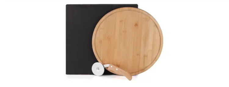 • Materiais: Tábua em bambu; cortador de pizza em bambu/inox.