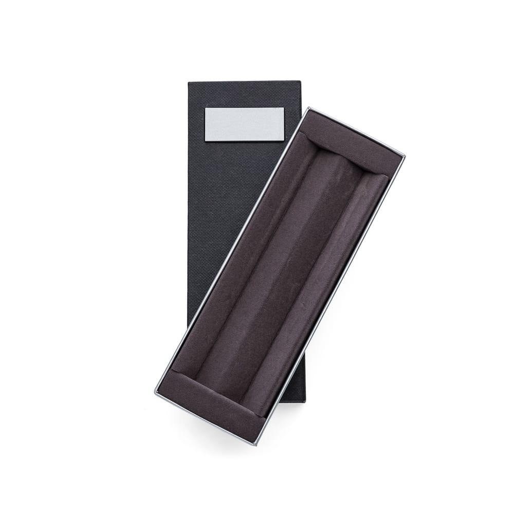 Estojo de papel para duas canetas. Capa de papel texturizado com placa plástica para personalização, estojo revestido com veludo.