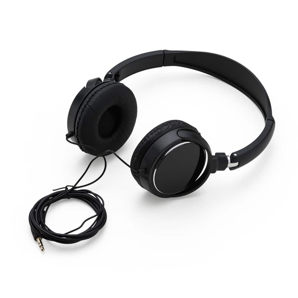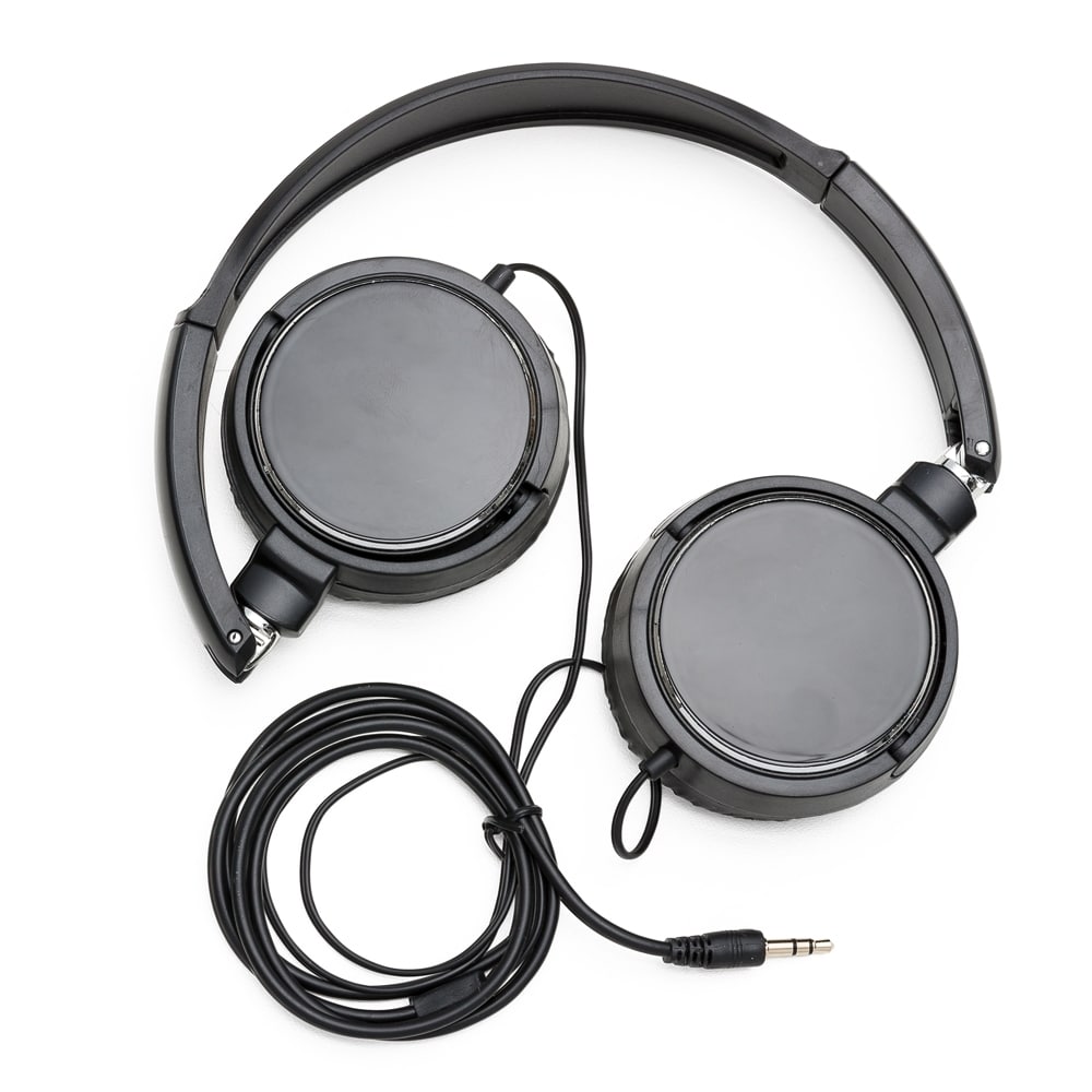 Headphone estéreo, plástico resistente com haste ajustável e fone giratório. Entrada P2.