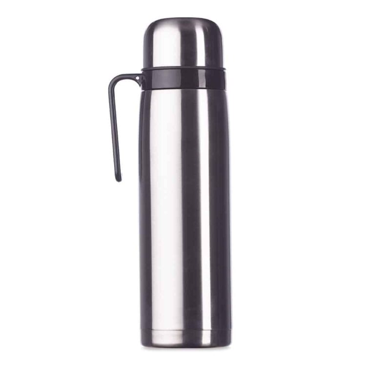 Garrafa térmica 1 litro em inox com alça plástica preta. Possui tampa rosqueável, tampa interna rosqueável com bico plástico vermelho.