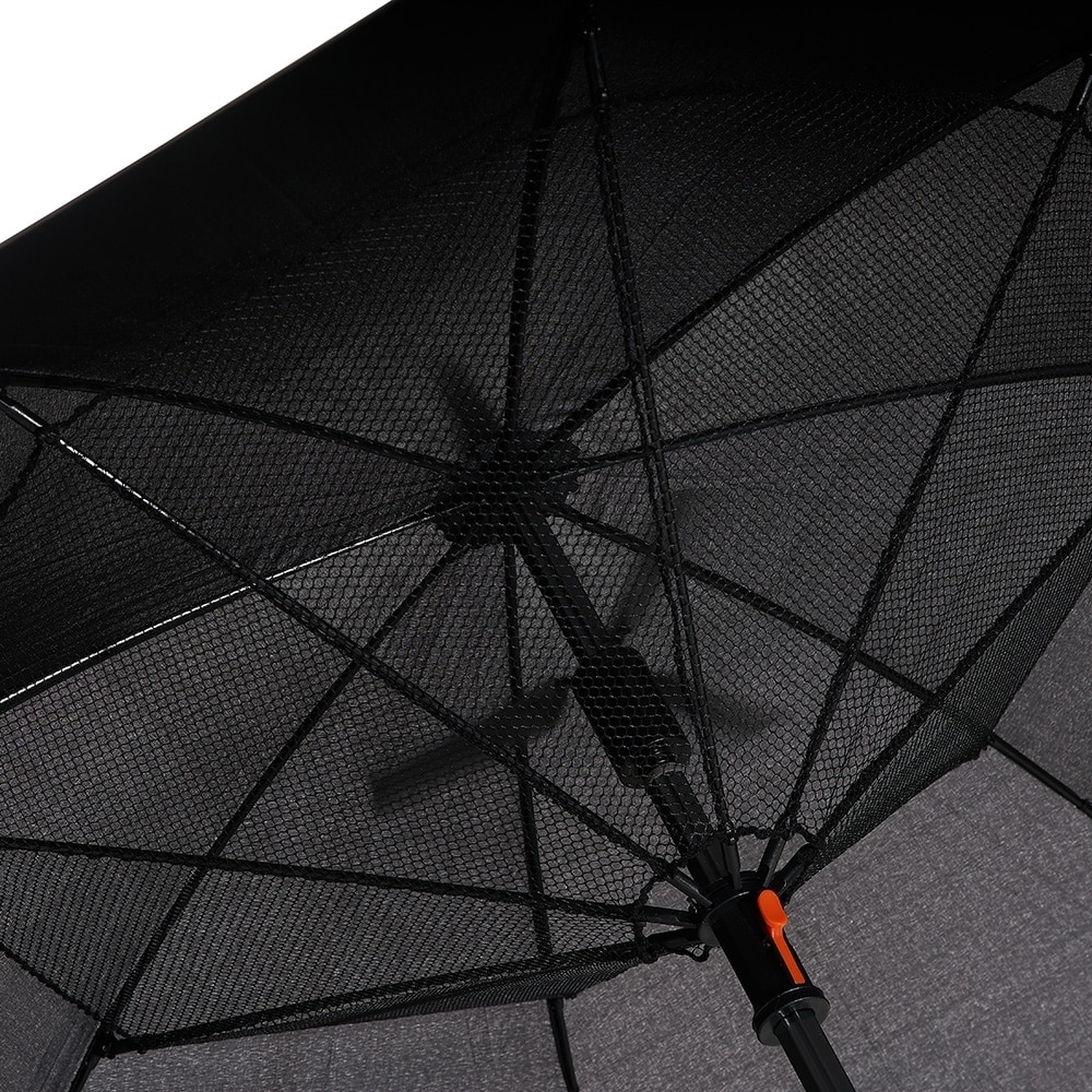 Guarda-chuva em Nylon 190T com ventilador embutido. Abertura e fechamento manual. Material: Estrutura em Metal cromado e Hastes em Fibra Detalhes: 8 Hastes e Cabo plástico. Ventilador funciona com 2 pilhas AA.