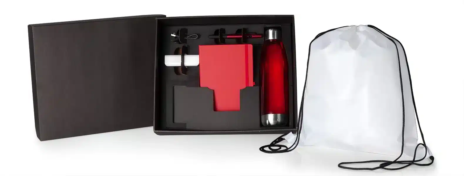 Uma gravação em Silkscreen na mochila, squeeze, carregador, caneta e caderno.; a Laser na tampa da caixa. Garrafa: 25x7cm