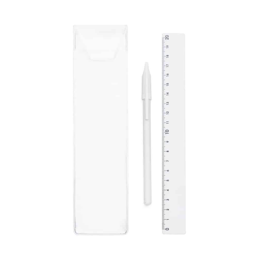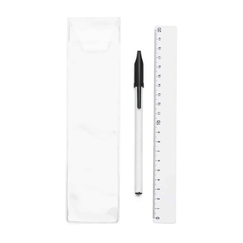 Kit régua e caneta plástica em estojo plástico transparente. Caneta simples com tampa e régua de 20cm.