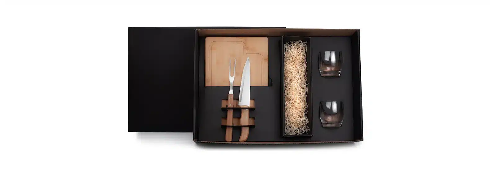 Uma gravação a Laser nos copos, na lâmina da faca, tábua e na tampa da caixa. Tábua: 37×22,5×1,5cm