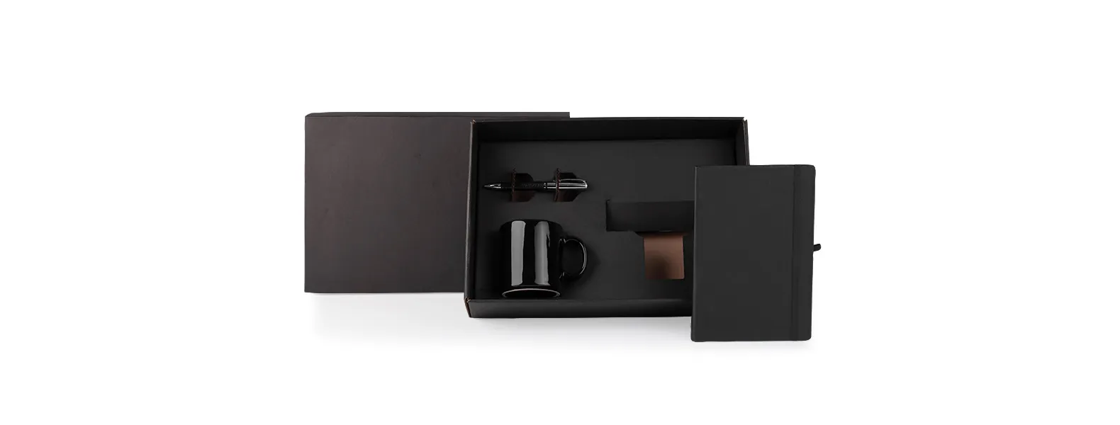 O Kit com Caneca e Acessórios – 3 Peças é uma combinação elegante e funcional, perfeita para presentear ou promover a marca da sua empresa. Composto por uma caneca em cerâmica preta, um caderno para anotações preto com capa dura, e uma caneta confeccionada em metal cromado brilhante com corpo revestido em material sintético preto texturizado, este conjunto proporciona uma experiência completa. A quantidade mínima para adquirir este kit é de 10 unidades.