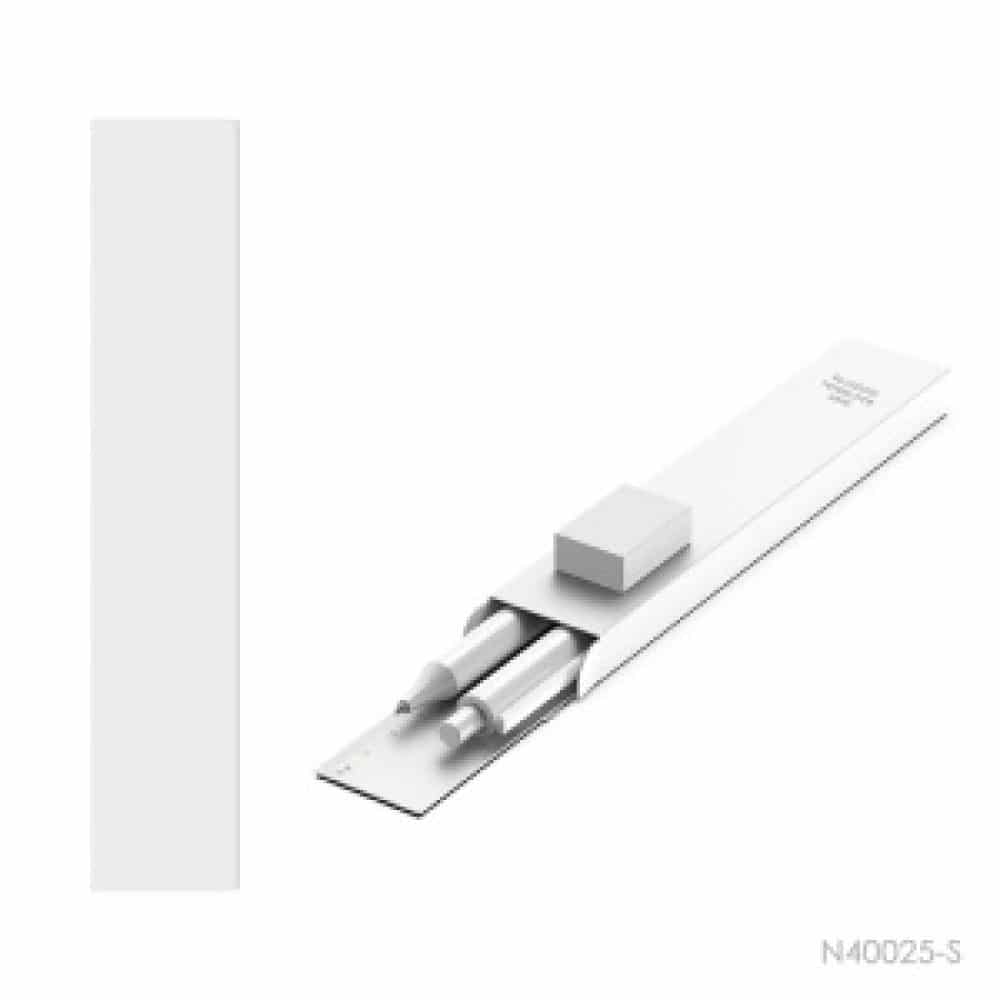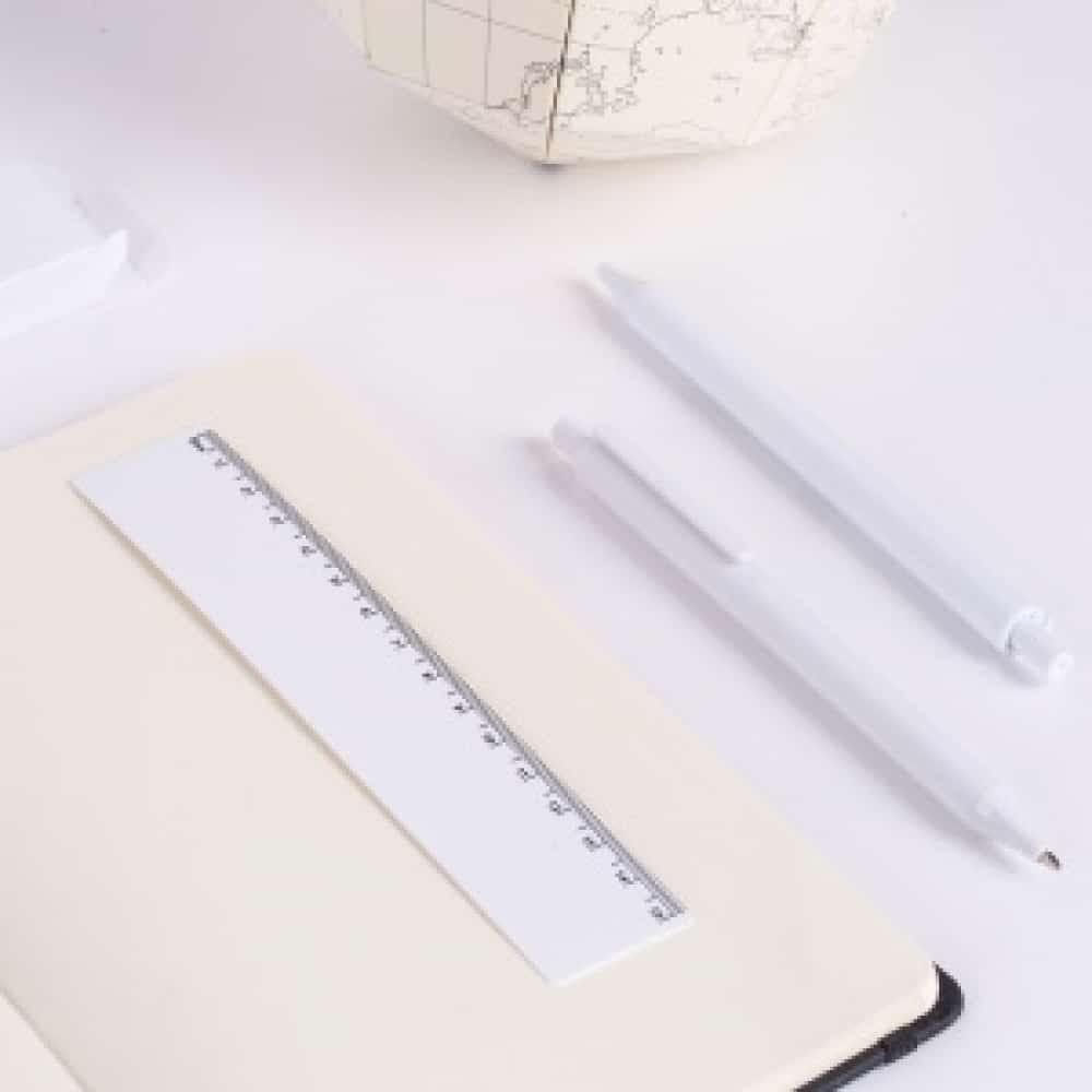 1 Caneta plástica retrátil 1 Lapiseira plástica retrátil 1 Régua plástica 15cm 1 Borracha.