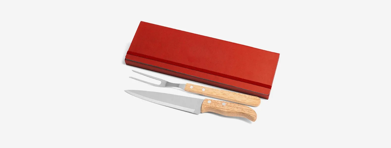 - Faca e garfo trinchante, ambos com cabos em madeira, oferecendo um toque ergonômico e estético durante o manuseio.