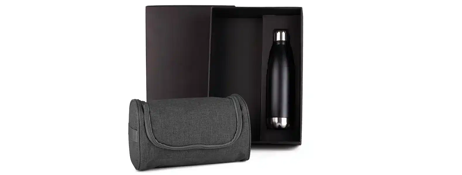 Ofereça praticidade e estilo com o nosso Kit Necessaire e Garrafa, uma combinação ideal para o dia a dia ou para viagens. Composto por uma elegante garrafa em aço inox e uma necessaire versátil em poliéster 300D melange cinza, este conjunto é perfeito para quem busca funcionalidade com um toque de sofisticação.