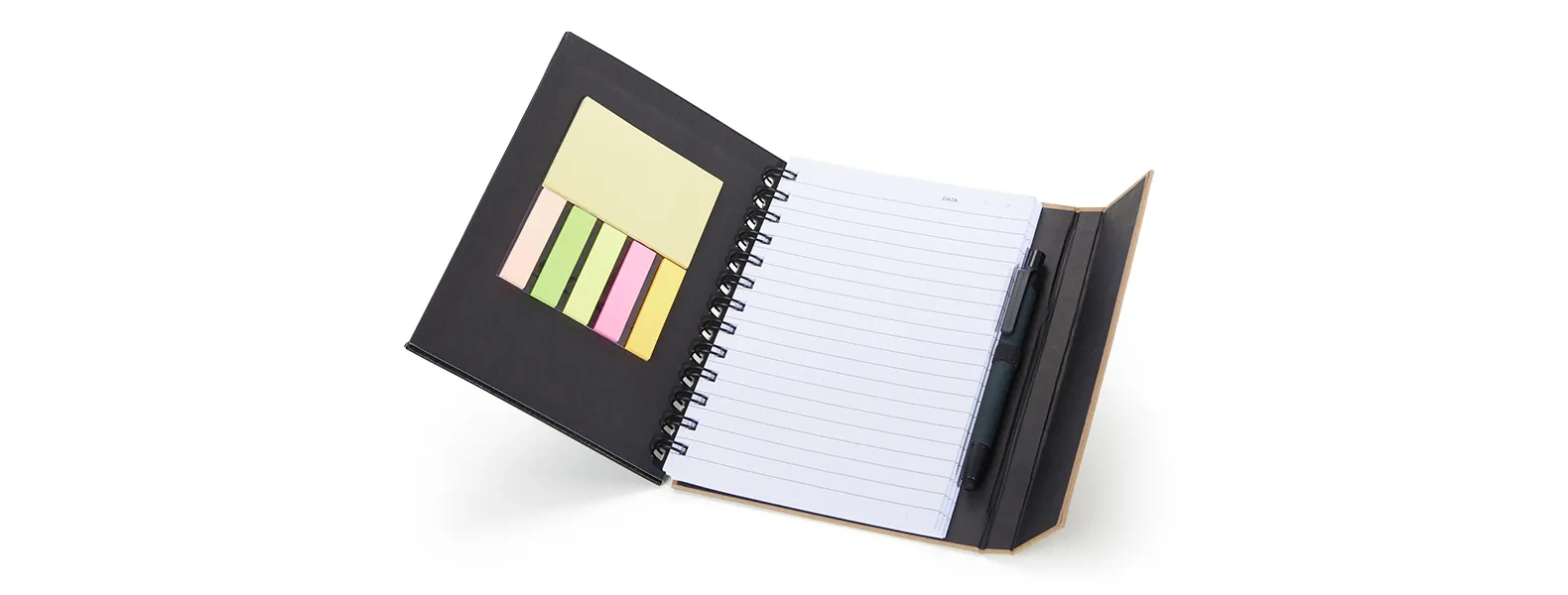 - Caderno espiral com capa em preto/bege, perfeito para anotações diárias.
