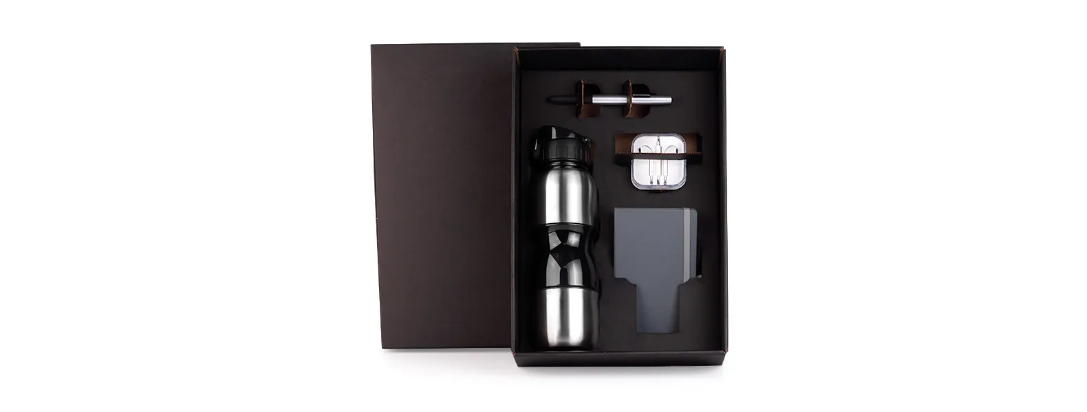 O squeeze em aço inox é durável e ideal para manter-se hidratado em movimento. O caderno para anotações oferece um espaço elegante para suas ideias. A caneta em plástico ABS prata proporciona uma escrita suave, e o fone de ouvido branco é perfeito para suas atividades diárias.