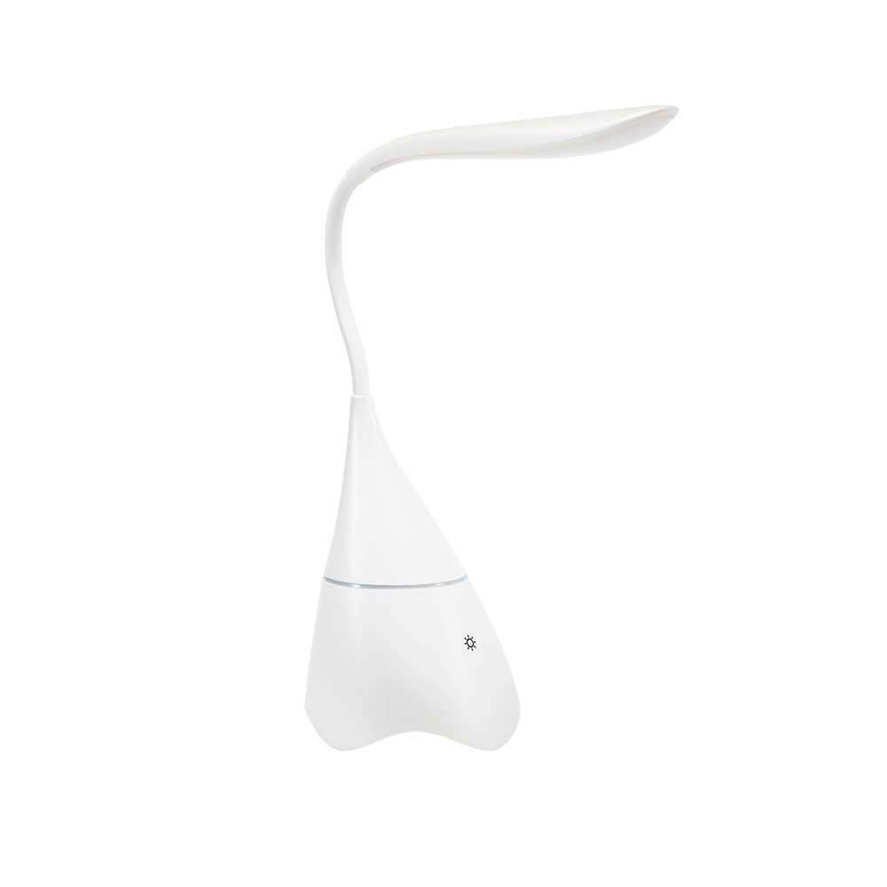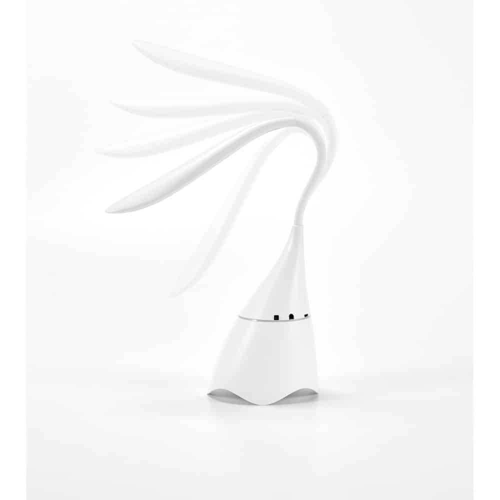 Luminária de mesa com caixa de som em ABS. Com 18 LEDs de alto brilho, botão tátil e braço flexível. Transmissão por bluetooth e ligação stereo 3,5 mm com 5W/4?. Autonomia até 6 h e conexão à playlist do dispositivo móvel. Incluso cabo USB para carregar. Fornecida em caixa presente.