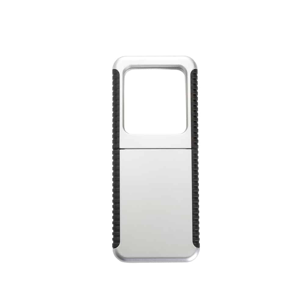 Lupa plástica com lanterna e destalhes emborrachados com relevo nas laterais. Para utilizar a lanterna basta levantar a lupa pelas laterais. Acompanha duas baterias CR-1220 Lithium.