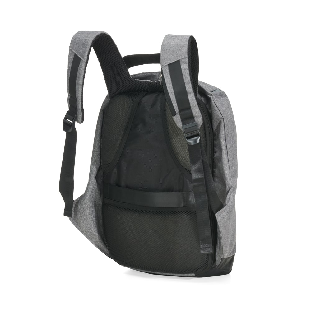 Mochila anti-furto de poliéster com detalhes em nylon. Com formato anatômico e design moderno, tem a parte frontal à prova d’água e tecido impermeável. Pensando na segurança do usuário foi confeccionado o compartimento principal na área traseira, impossibilitando a abertura do produto mesmo com a mochila na costa do usuário. Possui suporte com entrada USB na parte externa e cabo USB acoplado internamente permitindo a conexão de um carregador portátil na área interna e a conexão de um eletrônico na área externa, viabilizando a carga e utilização do eletrônico enquanto caminha. Área interna do compartimento principal: bolso para notebook 14 polegadas, quatro bolsos para acessórios, bolso com zíper possui nas laterais internas sistema de velcro, maximizando a segurança da mochila. Alças para as costas ajustáveis revestidas com espuma para um maior conforto sendo uma delas com bolso de zíper, alça para mãos e alça horizontal para encaixe em malas de viagem.