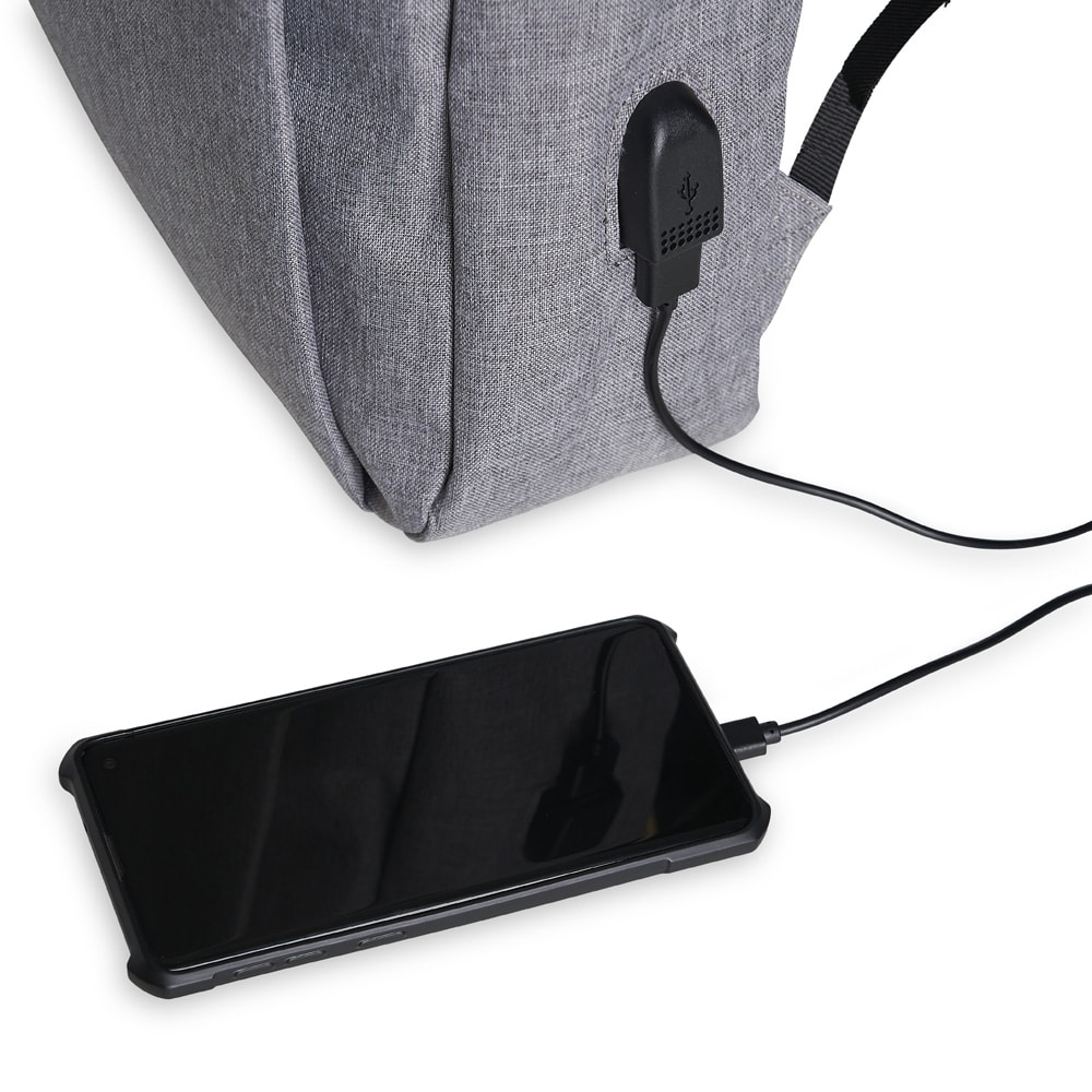 Mochila confeccionada em nylon com compartimento para notebook até 15,6 polegadas. Contém compartimento grande com divisórias para documentos, eletrônicos e caneta, compartimento mediano com abertura vertical, compartimento frontal, bolso lateral e adaptador USB externo com cabo acoplado, permitindo a conexão de um carregador portátil de dentro da mochila e transferência da carga para o lado externo, ocultando o carregador e viabilizando a utilização do celular durante o processo. Contém zíperes com pegadores plásticos, alça de mão em nylon e alças para as costas ajustáveis com revestimento espumado antitranspirante.