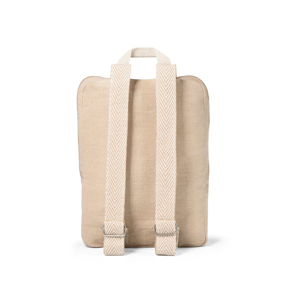 Mochila em juco (275 g/m²) com um compartimento principal e bolso frontal com fecho. Pega em webbing de algodão no topo e alças ajustáveis em algodão bicolor.