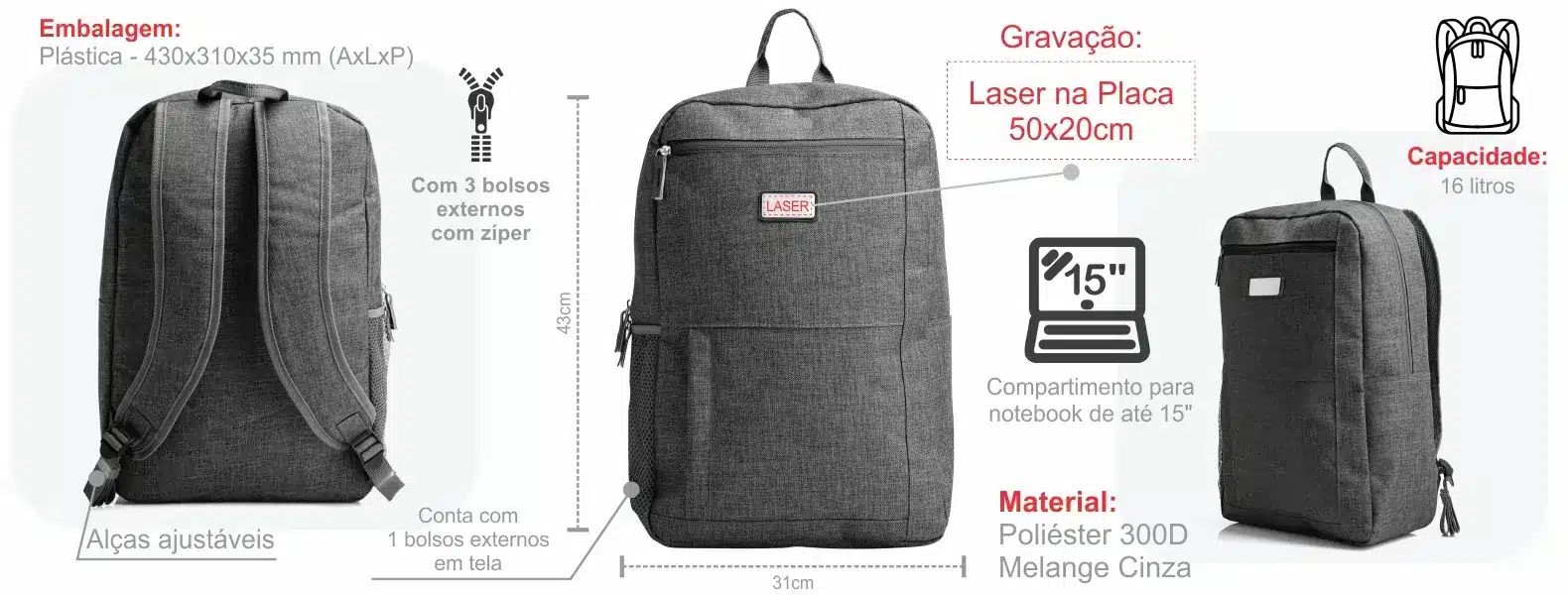 - Poliéster 300D Melange Cinza: Fabricada em poliéster 300D melange na cor cinza, proporcionando durabilidade e um visual contemporâneo.