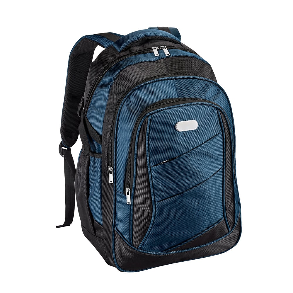 Mochila para notebook. 1680D e 300D. Com 2 compartimentos. Compartimento principal com divisória almofadada para notebook até 15.6”. Interior forrado. Com 3 bolsos frontais e 2 bolsos laterais. Parte posterior almofadada, com sistema de apoio acolchoado para as costas e alças almofadadas. Placa metálica removível com imã, para fácil gravação.