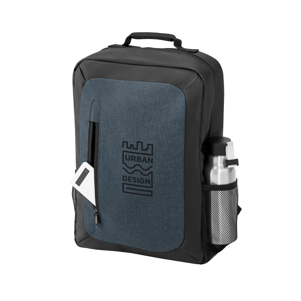 Mochila para notebook. 600D de alta densidade e poliéster 600D impermeável. Compartimento principal almofadado para notebook até 15.6”. Bolso frontal com zíper. Dois bolsos laterais em tela. Parte posterior almofadada, com sistema de apoio acolchoado para as costas e alças almofadadas.