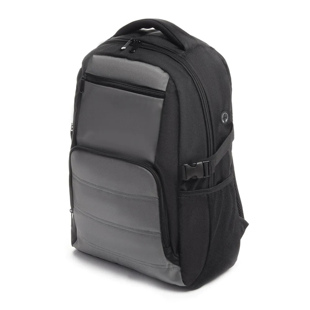 Mochila para notebook em tecido poliéster. Parte externa: 1 compartimento, alça de mão e ombro acolchoado, saída USB e fone de ouvido, 2 bolsos frontais com zíper e 2 bolsos laterais. Parte interna: Compartimento acolchoado para notebook de até 15