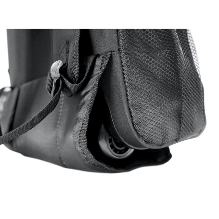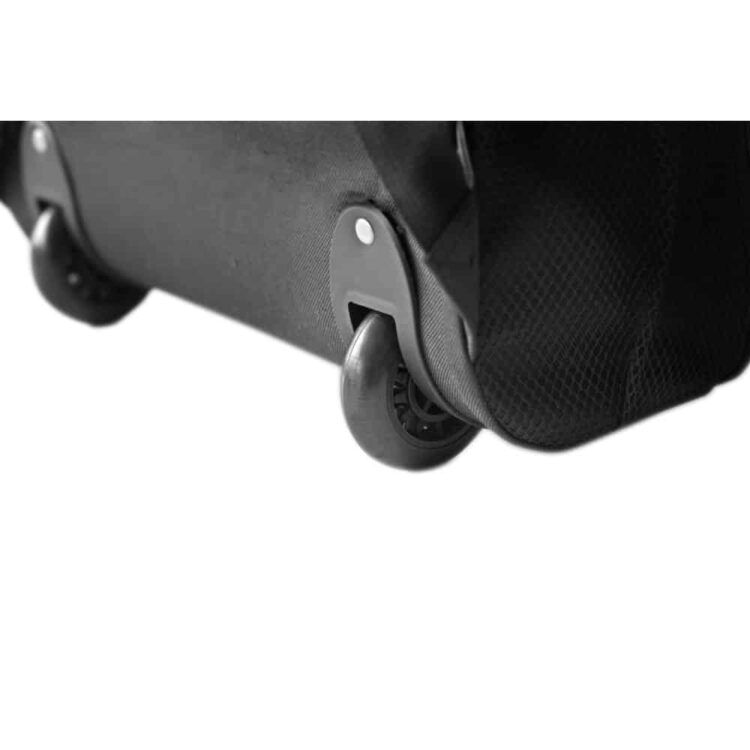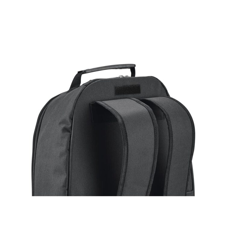 Mochila trolley para notebook. 1680D e 300D. Com 2 rodas. Compartimento principal almofadado para notebook 15.6”. Segundo compartimento forrado e com diversos bolsos. Bolso frontal com zíper e bolsos laterais com tela. Com protetor de rodas e alças almofadadas. Pega extensível em metal, com mola (altura da pega estendida até 530 mm). Placa metálica removível com imã, para fácil gravação. Capacidade até 24 L. Peso: 1,65 kg.