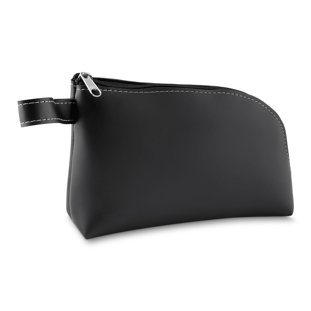 Necessaire em couro sintético preto com alça lateral. Gravação frontal na opções: serigrafia e plaquinha.