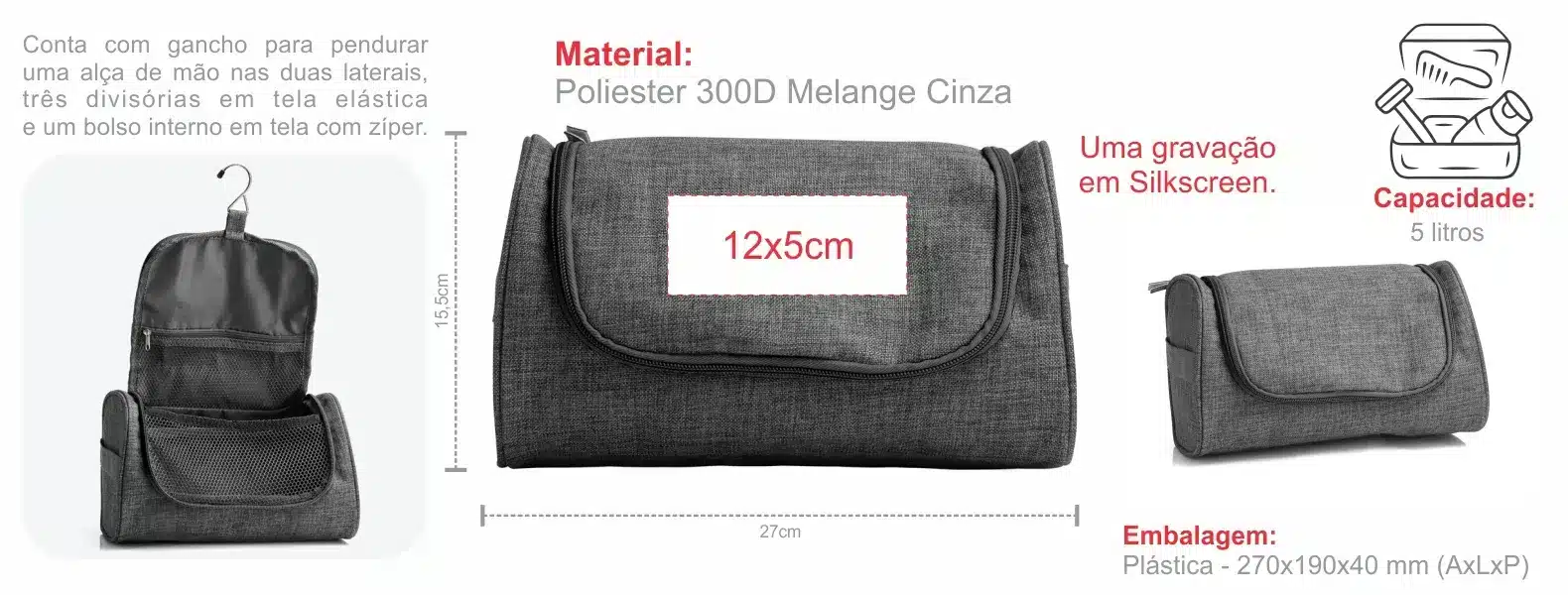 Esta Necessaire em Poliéster 300D com Gancho na cor melange cinza é a escolha perfeita para quem busca funcionalidade aliada a um design elegante. Mantenha-se organizado com estilo em suas viagens!