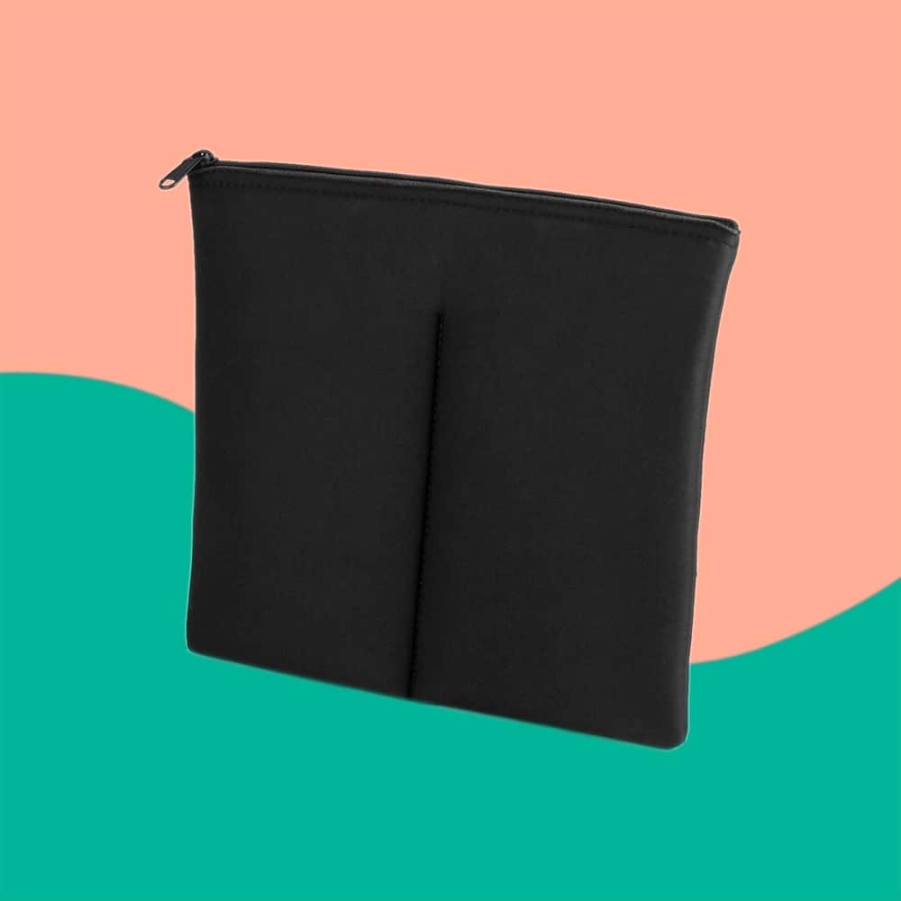 Organizador em neoprene com dois compartimentos e fechamento em zíper, para armazenar objetos em geral e cabos.