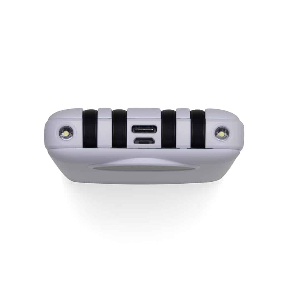 Carregador portátil de 10.000mAh com display digital indicador de bateria, contém duas lanternas de led e quatro cabos de saída acoplados, sendo: saída Lightning, saída Tipo-C, saída V8 e saída USB. O carregador possui uma porta USB dupla (entrada e saída) com carga rápida e outras duas portas de entrada: V8 e Tipo-C. Acompanha cabo USB.