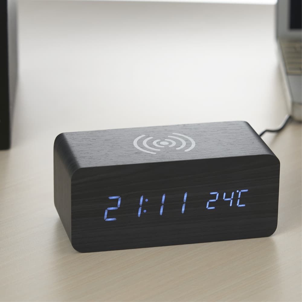 Relógio digital LED com alarme e carregamento por indução, pode ser utilizado através da fonte USB (acompanha) ou 3 pilhas AAA (não acompanha). Produzido em MDF, o relógio possui um display LED na parte frontal, área para carregamento via indução na parte superior, parte traseira com mecanismo para ajustes, entrada DC 5V e compartimento de pilhas.