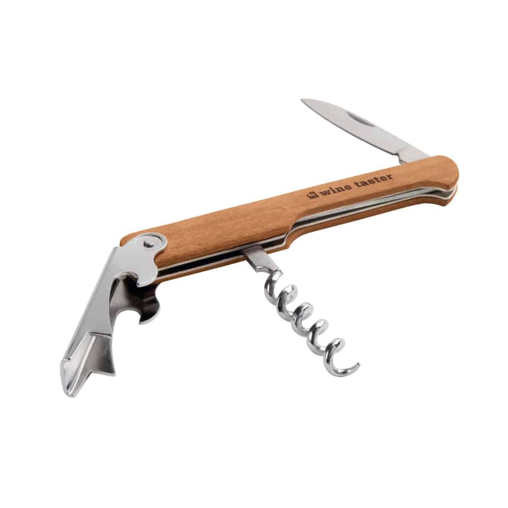 Saca-rolhas. Madeira. Com abridor de garrafas e canivete de sommelier.