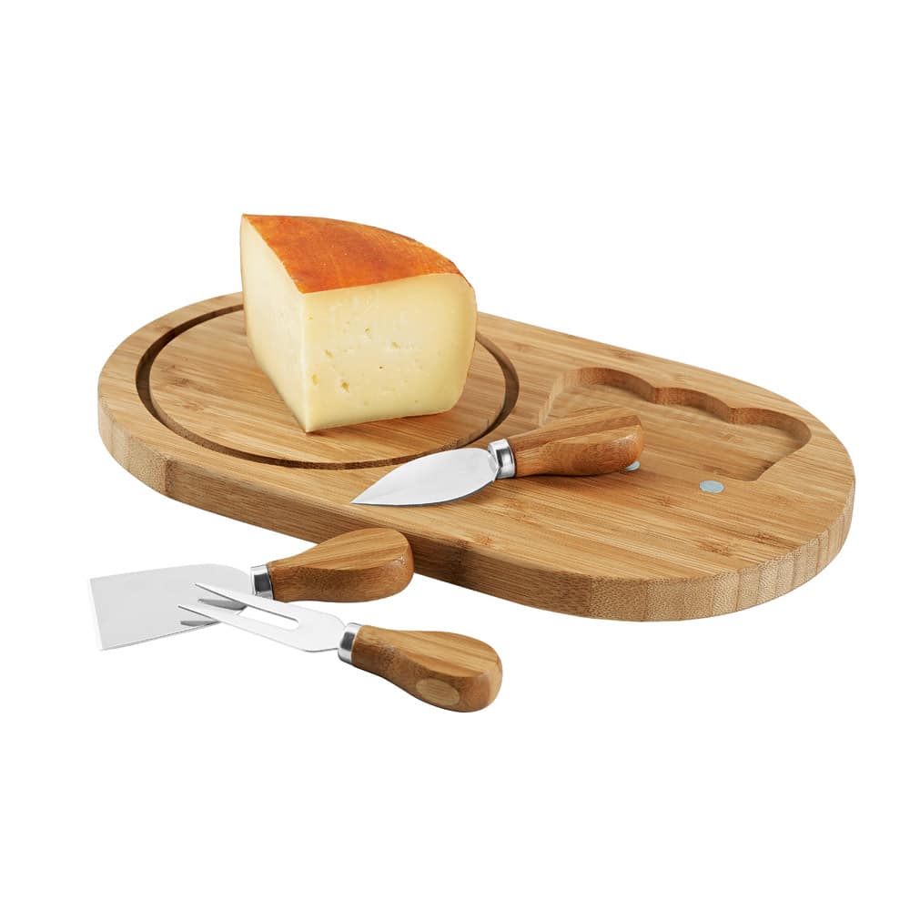 Tábua de queijos. Bambu e aço inox. Com 3 talheres. Incluso caixa de cartão. Food grade.