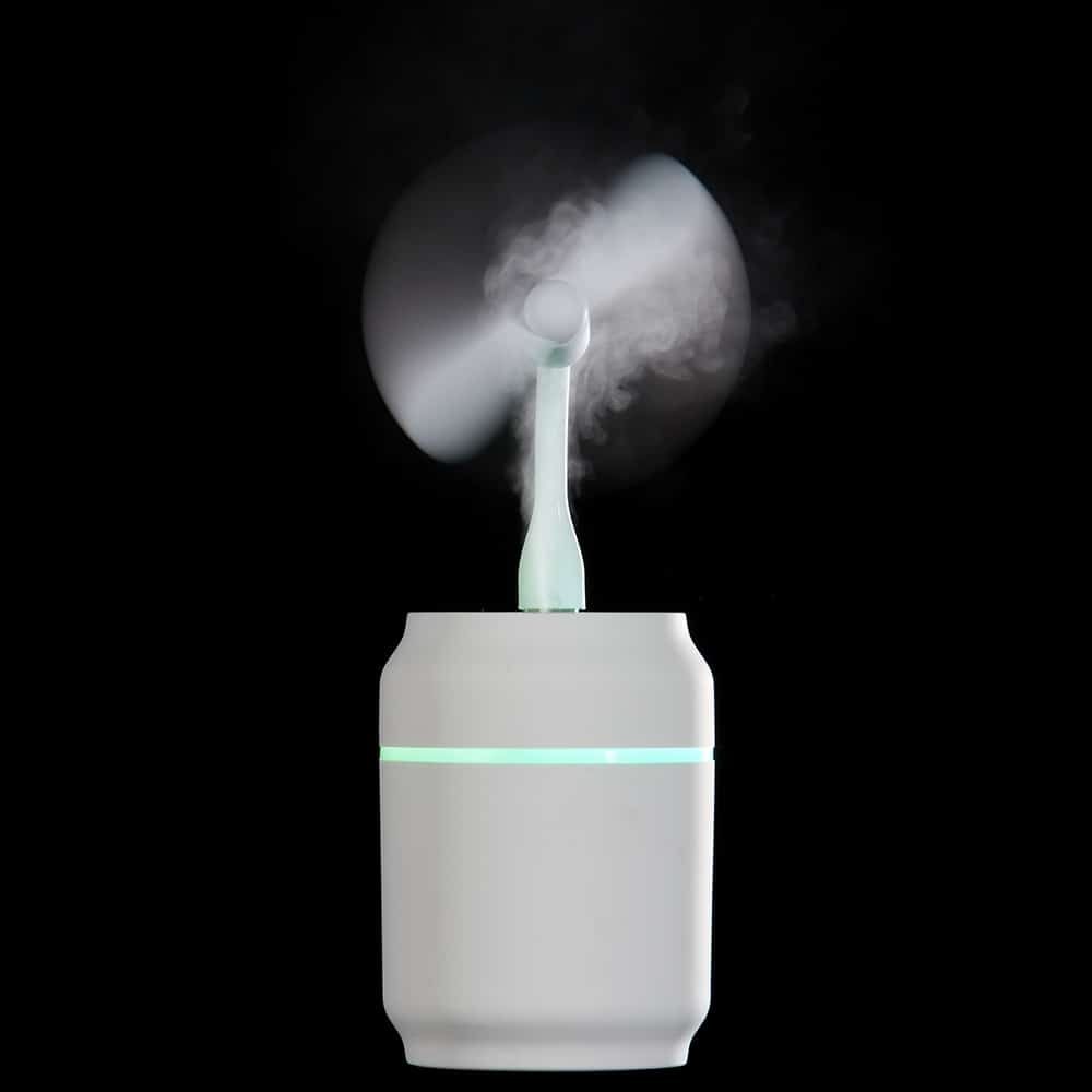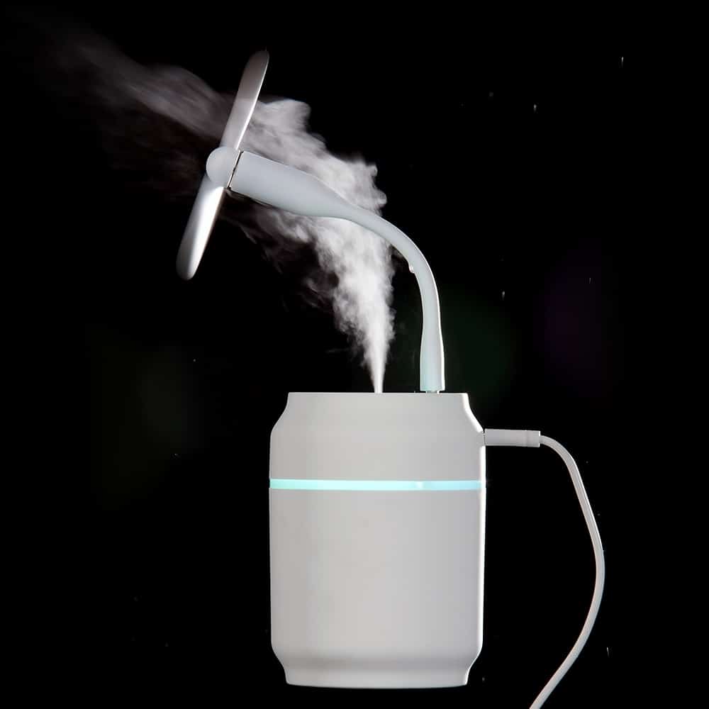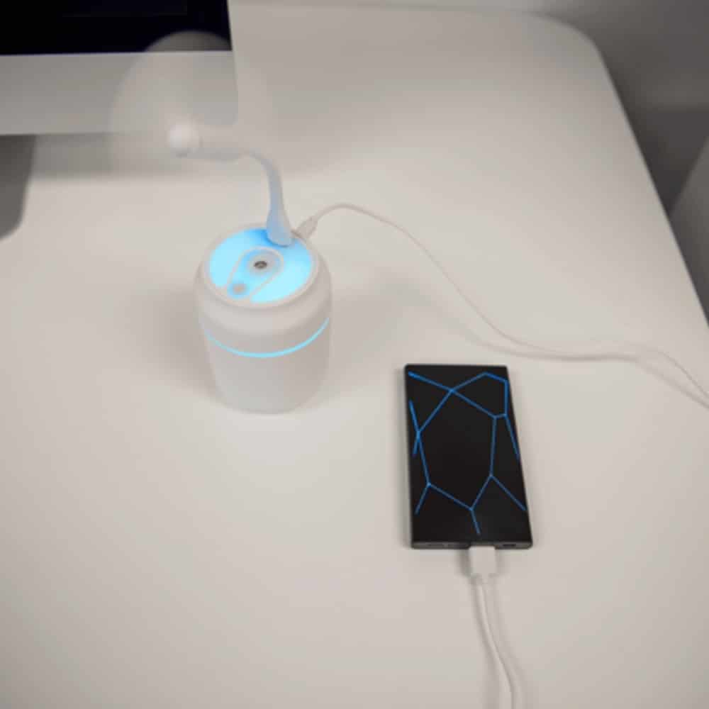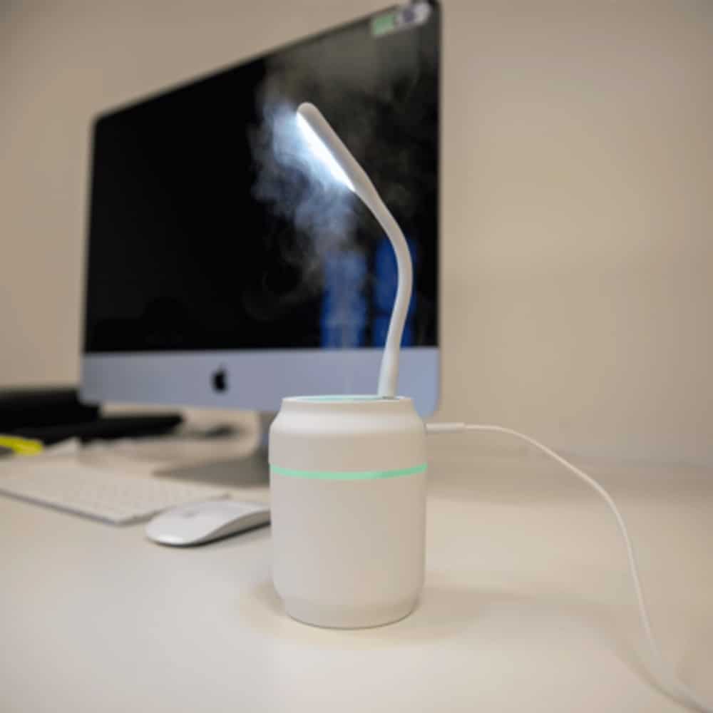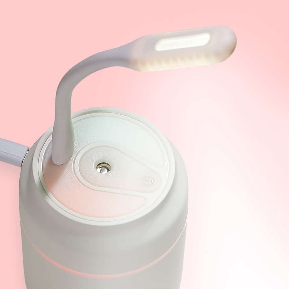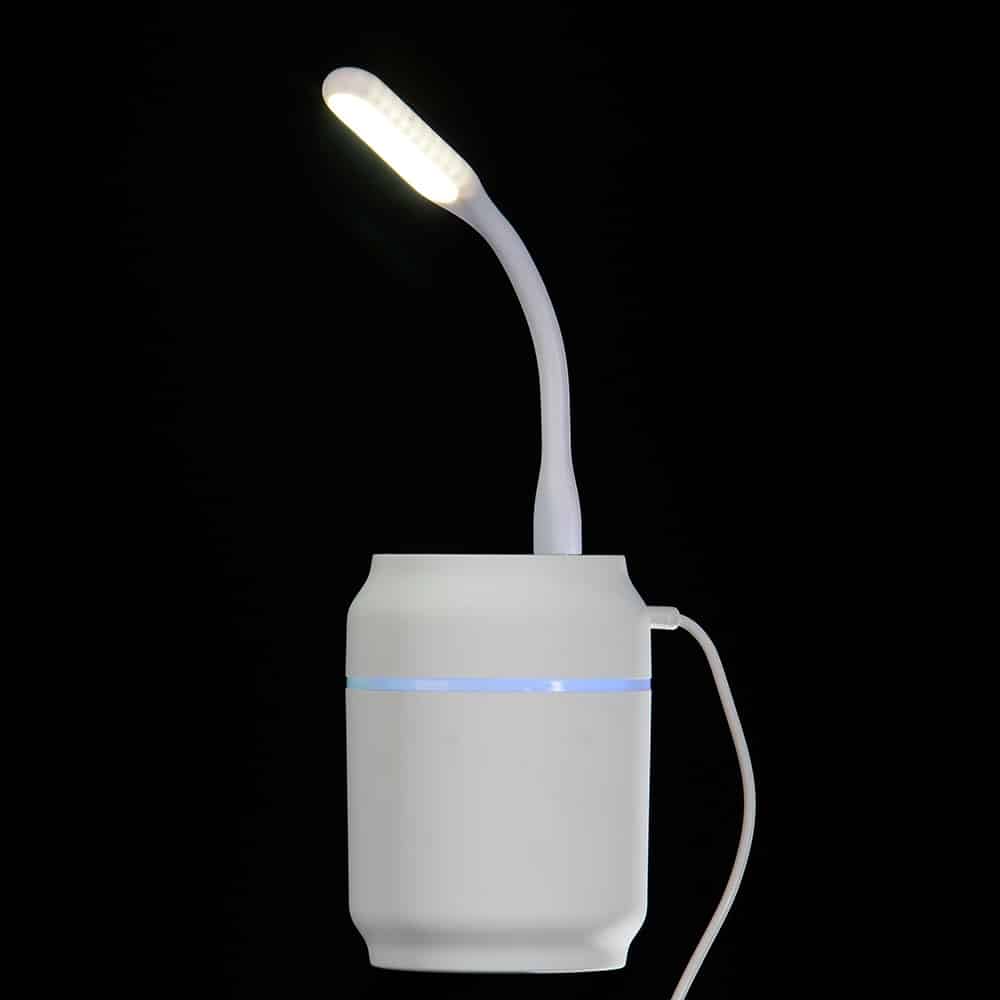 Umidificador de mesa com 200ml de capacidade, funcionamento por 8 horas, carregamento via USB e iluminação colorida, caso desejado. Ele possui uma saída USB para encaixe de lâmpada Led ou ventilador, ambos inclusos na compra.